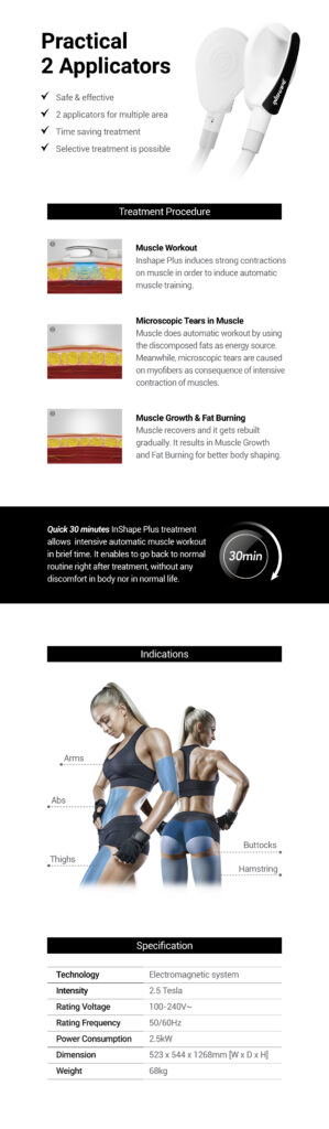 InShape Plus is a new generation of Electromagnetic system for Body Shaping. Inshape Plus applies super electric impulses generated by electromagnetic field for muscular contractions. It results in more toned and firmer muscle of abs, thighs and buttocks for better aesthetic appearance.